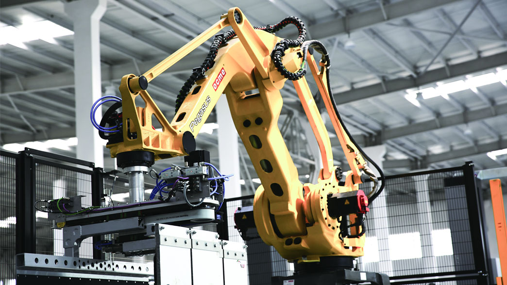 產品由自動裹包機打包封箱之后,經貼標機、復檢稱重機再由碼垛機器人進行碼垛。在OCME全自動高速灌裝線上,碼垛機器人起到了壓軸作用。在高速生產的節奏下,碼垛機器人可以快速、精準、平穩地將貨物放置在托盤之上。除了自動循環之外,還可以手柄操作機器人手臂或進行參數設置來適應生產的需要。